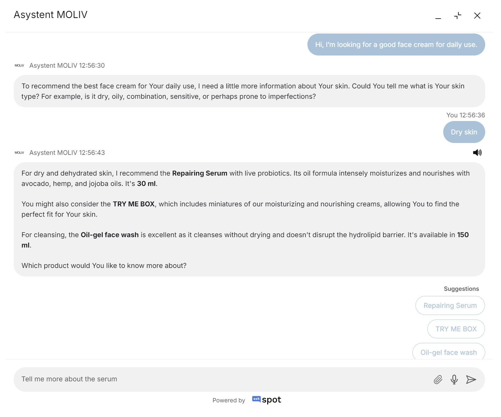 AskSpot Chat AI was deployed on molivcosmetics.com, integrated with Moliv's WooCommerce product catalogue and a custom knowledge base covering formulations, ingredients, and skincare routines.